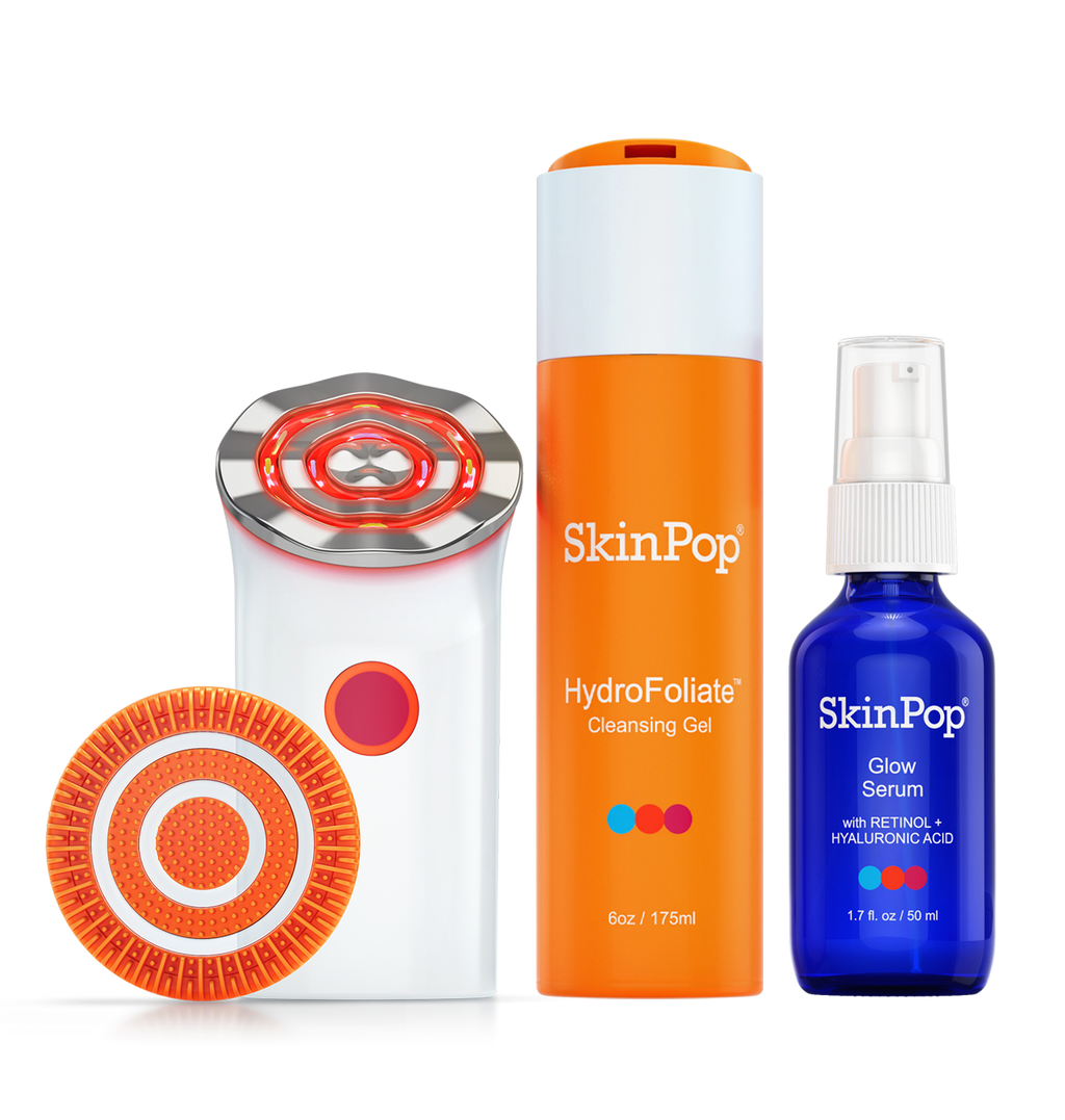 The SkinPop Technobrush™ combines therapeutic red light therapy with a gentle Hydrofoliating Cleanse. It also massages and infuses your skin with our patented Glow Serum for instantly radiant skin.